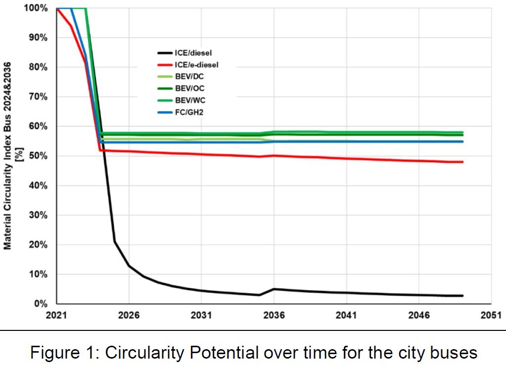 In the IEA Technology Collaboration Program experts from 20 countries focus on LCA of EVs since 2010. The IEA Task 46 developed a new methodology to assess the Circularity Potential using a dynamic LCA approach and applied it in a case study to city buses using electricity, hydrogen, diesel and e-diesel. For LCA Circularity is define by Task 46: A product or service is “100% circular“, if its whole life cycle - production, operation and end-of-life - uses only reused components, secondary/recycled material, renewable energy and makes no waste and GHG emissions. The Circularity Potential is assessed based on the mass flows of the buses during their lifetime using data of the Inventory Analysis for the Material Circularity Index (MCI) - 100% = circular and 0% = linear – applying the Linear Flow Index of materials (LFImaterial) and the Utility Factor of product (UFproduct). Figure 1 shows the Circularity Potential over 24 years life time for the city buses. All systems start in nature with an MCI of 100% before the construction phase. During the construction, phase the MCI decreases significantly, for e-fuel and H2 more than for electric city buses due to the higher demand of renewable power plants. In the operation phase the MCI for systems using renewable electricity nearly remains constant beside a small influence due to the spare parts and maintenance. For systems, using fossil energy the MCI is drastically reduced in the operation phase due to the non-circularity of fossil fuel combustion.
