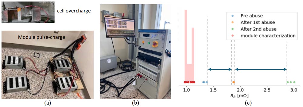 Figure: (a) cell and modules under test (b) module tester (c) detection of over-charge abuse.