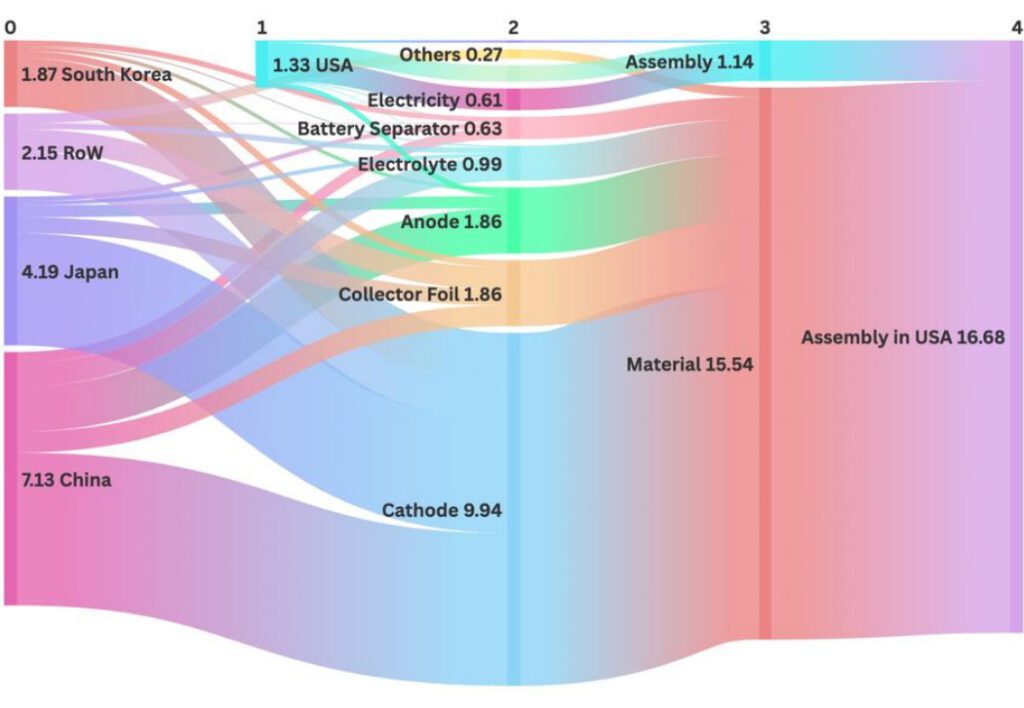 Figure 1. GWP Impact of NMC 811 Battery Cell Production as per Current Supply Chain Scenario (in KgCO2-eq), highlighting that the majority of battery components, such as the cathode, anode, electrolyte, battery separator, etc., are imported to the US from different countries. The supply chain stages are numbered as follows: 0, 1 represents locations, 2 represents components and energy sources, 3 represents materials and energy, and 4 represents the final assembly stage