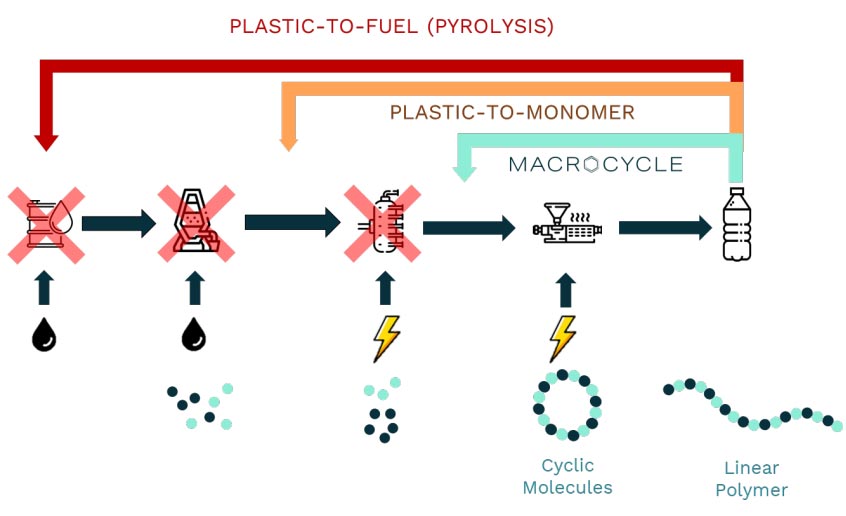 Figure 1: MacroCycle’s process circumvents existing depolymerization technologies with a simpler and non-destructive process, utilizing cyclic molecules as intermediates.
